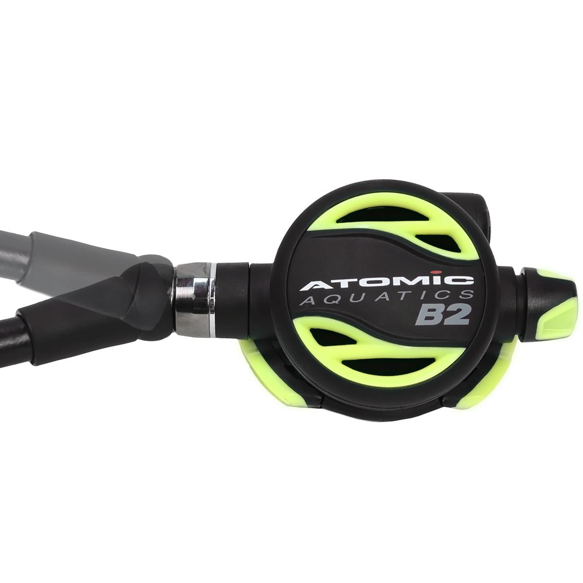 The B2 equipped with Atomics patented Automatic Flow Control (AFC). This unique diaphragm activated vain automatically controls the flow and Venturi effect of the second stage for optimum breathing resistance at all depths. The second stage does have a rapid adjustment knob for manual second stage de-tuning in rare special situations. The B2 Octopus has a has a bright yellow front cover for easy identification in an out-of-air-emergency and a 36" (91.4cm) 3/8" threaded low-pressure (LP) hose. The regulator is also equipped with a dual silicone comfort fit mouthpiece with tear resistant bite tabs and weighs 13.15 oz (373 g) with the hose.