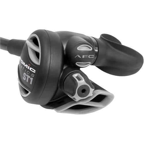 Equipped with Atomic's patented automatic flow control (AFC), the ST1 second stage optimizes breathing resistance at all depths. A soft, over-molded rapid adjustment knob is available for special situations. Atomic's comfort swivel eliminates the "pulling effect" when turning underwater, allowing 30 Degree of rotational movement without kinks. The regulator includes a 3/8" threaded, 32" low-pressure hose and weighs 2.3 lbs. An owner's manual is also provided.