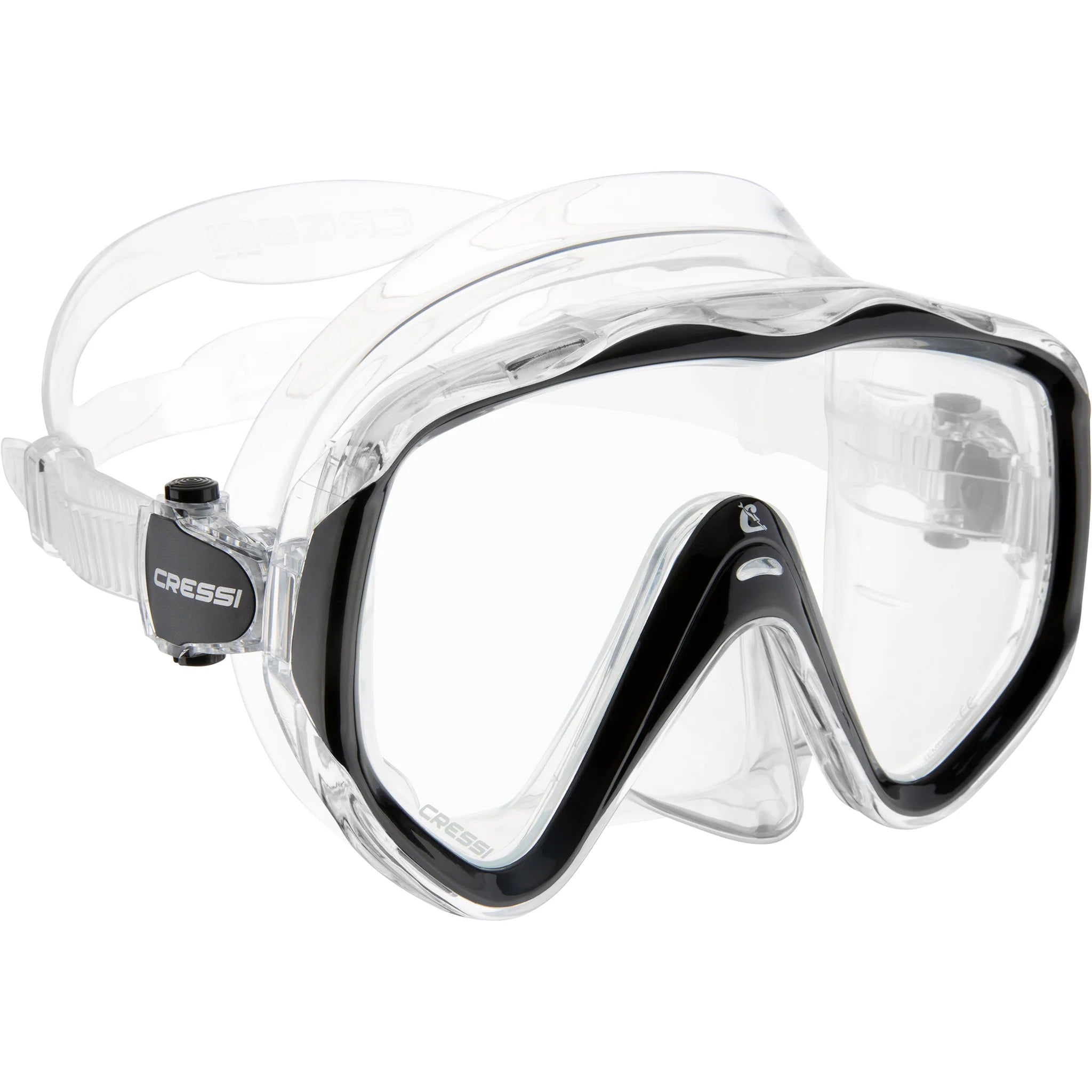The Cressi Liberty 1 Window Mask gives the diver a wide unobstructed field of vision while snorkeling or when using Scuba. Mask is equipped with easy adjust buckles and has a wide anatomical silicone rubber split style designed mask strap for even dispersion of pressure for increased fit and comfort. Mask has an easy-to-reach one-hand nose pocket for ear equalization which can be utilized even when wearing thick gloves. The double feathered edge silicone skirt works in concert with the split strap for an excellent seal on the face. Mask has a tempered safety glass lens.