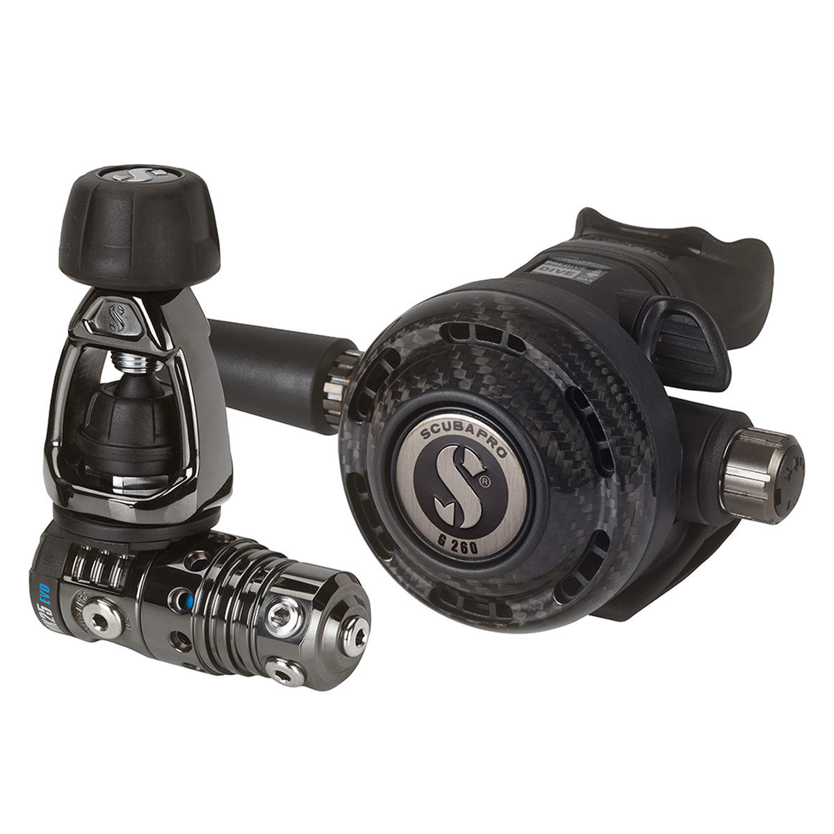 The upgraded MK25 EVO BT/G260 Carbon BT regulator system by Scubapro combines the popular G260 technical diving system with enhanced durability, featuring a carbon fiber cover and Black Tech finish. The balanced piston MK25 EVO BT provides excellent resistance to freezing, outstanding inhalation sensitivity, and instant air delivery.